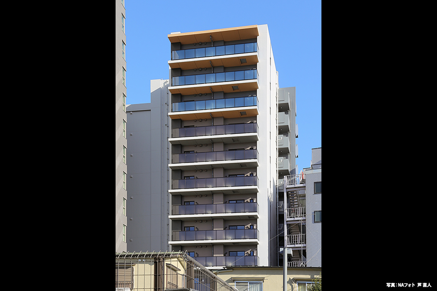 低層部は旧中山道の地歴に呼応した「格子」などの伝統的な和の要素を取り入れながら、特別感・存在感のあるエントリーファザードをデザインするとともに堅牢な基壇構成とし、住宅としての安心・安全を具現化するデザインとした。
