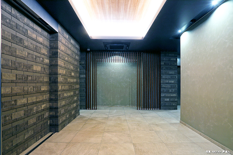 共用部は外観の和の素材を内部まで引き込み、風合いと温かみを感じさせる心地よいアプローチを演出。また内部廊下は明るさを適度に抑制することで空間に落ち着きを与えホテルライクな上品さを演出する。
