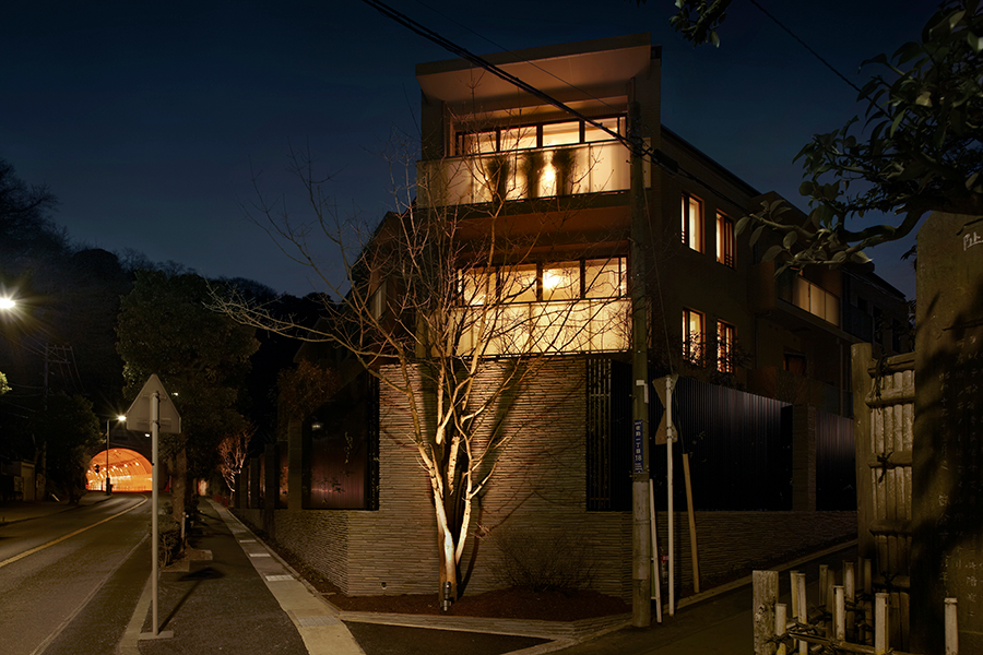 計画地は、鎌倉駅に近く緑豊かな山並みを背景とした良好な自然環境の中にある。建物の配置は、道路や隣地から出来るだけ後退し、圧迫感の軽減や景観等に配慮した。通り沿いのファサードは、結界性を明確に示す堅牢なデザインを施し、ハイグレードな印象を与えるよう心掛けた。特に南東角のファサードはこの建物の顔として、また地域のランドマークともなることを目指している。エントランスから各住戸玄関へと続くシークエンスは、水と緑で演出された中庭と一体となって繋がり、住む人が自然に囲まれた雰囲気を享受できるよう配慮している。当計画では、基本計画に加えファサード・パブリックスペースのデザイン提案及び監修を行っている。